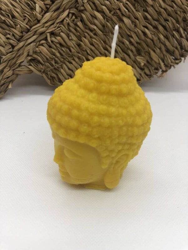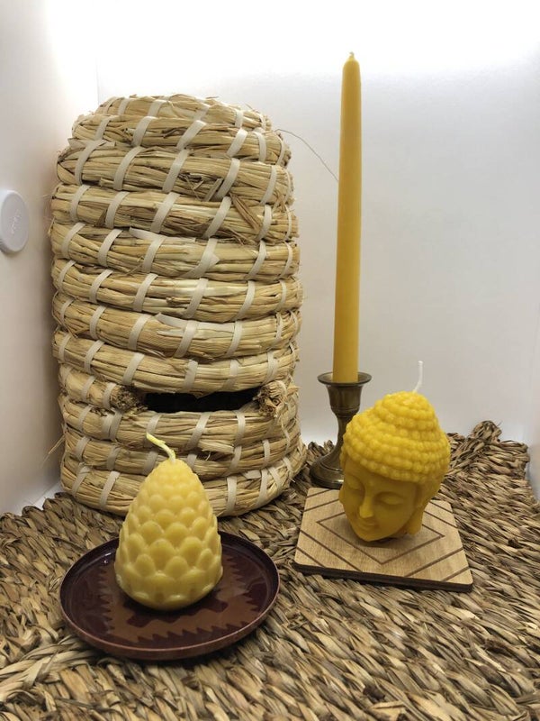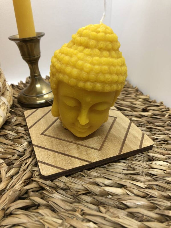 Bougie artisanale buddha à la cire d'abeille naturelle, obtenue par la fonte des opercules directement après l'extraction du miel.
